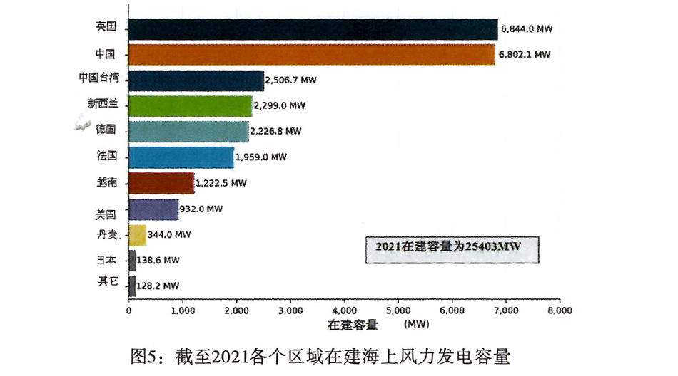 基于在建項目的可用數據,如圖5所示,到2027年的近期預測,全球有25403MW的新海上風能項目正在建設中。