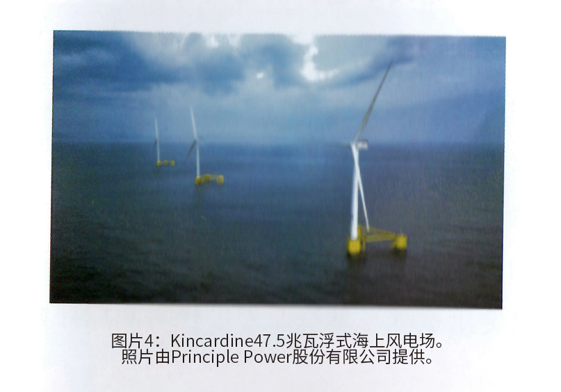 浮動海上風提供了一個機會,相比底部固型海上風電,浮式海上風電可在更深(人I 60m)的水域中,從而進入具有高質量風資源的大得多的海洋區域.在美國,大部分海上技術風力資源位于水深超過60米的地方,而在歐洲,這一數字估計為80%.在全球范圍內,浮式海上風能市場的發展軌跡在歐洲、亞洲和北美繼續處于試點規模(10兆瓦至100兆瓦).該試點和示范階段包括預計在2022年至2024年期間大多數項目開始運營,預計將提供數據和經驗,為最早可能在2025年安裝的成本效益高的商業規模項目的開發提供資料信息.截至2021年底,全球有10個浮式海上風能項目在運營,19個項目總計123.4 MW 這10個項目中有7個(112.9MW)位于歐洲,3個(10.5 MW)位于亞洲2021,三個海上浮式風力發電項目上線,總容量為56.5兆瓦.迄今為止最大的浮動海上風電項目是蘇格蘭新的47.5兆瓦金卡丁海上風電場,如圖4所示,該風電場于2021上線(Principle Power,股份有限公司,2021).由中國三峽集團(Russell,2021)開發的5.5兆瓦浮動示范項目也開始在中國運行.此外,Suiesdal海上風電3.6兆瓦TetraSpar示范項目在挪威200米水深開始運行(Stiesdall a/S,2021)