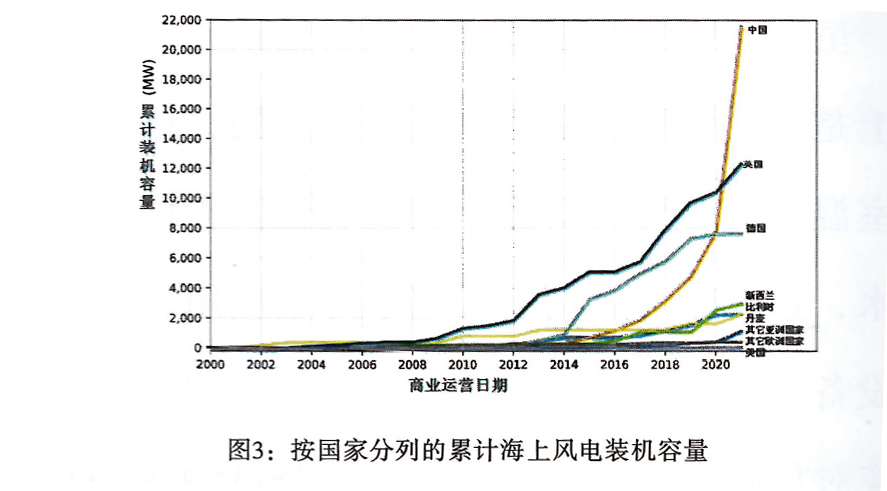2021年,中國裝機容量為13,790MW,一年內裝機容量超過了全球以往任何一年的裝機容量.英國的年部署量僅次于美國,為1855MW,其次是越南(634MW)、丹麥(605MW)、荷蘭(402MW)和中國臺灣(109MW).到2021年底,海上風電總容量從254個運營項目增至50623MW。中國的快速崛起極大地改變了全球海上風電部署在歐洲和亞洲市場之間的分布。歐洲仍然擁有大部分累計海上風電裝機容量,約27881MW,占全球總量的55.1%.然而,2021,亞洲的市場份額急劇上升至44.8%(22701MW).北美的新興市場是第三大市場,裝機容量僅為42 MW.如圖2所示,2021對海上風力發電能力增長貢獻最大的三個國家是中國、英國和越南。